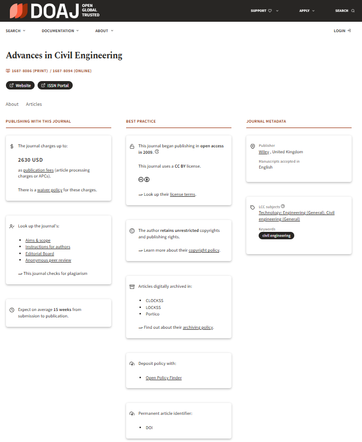 Xuất bản bởi Wiley, Advances in Civil Engineering là tạp chí học thuật quốc tế chuyên sâu về kỹ thuật dân dụng như kết cấu công trình, địa kỹ thuật, giao thông, thủy lực, vật liệu và an toàn xây dựng. Tạp chí hướng tới cộng đồng học giả, kỹ sư thực hành và các tổ chức nghiên cứu trong ngành xây dựng và hạ tầng.