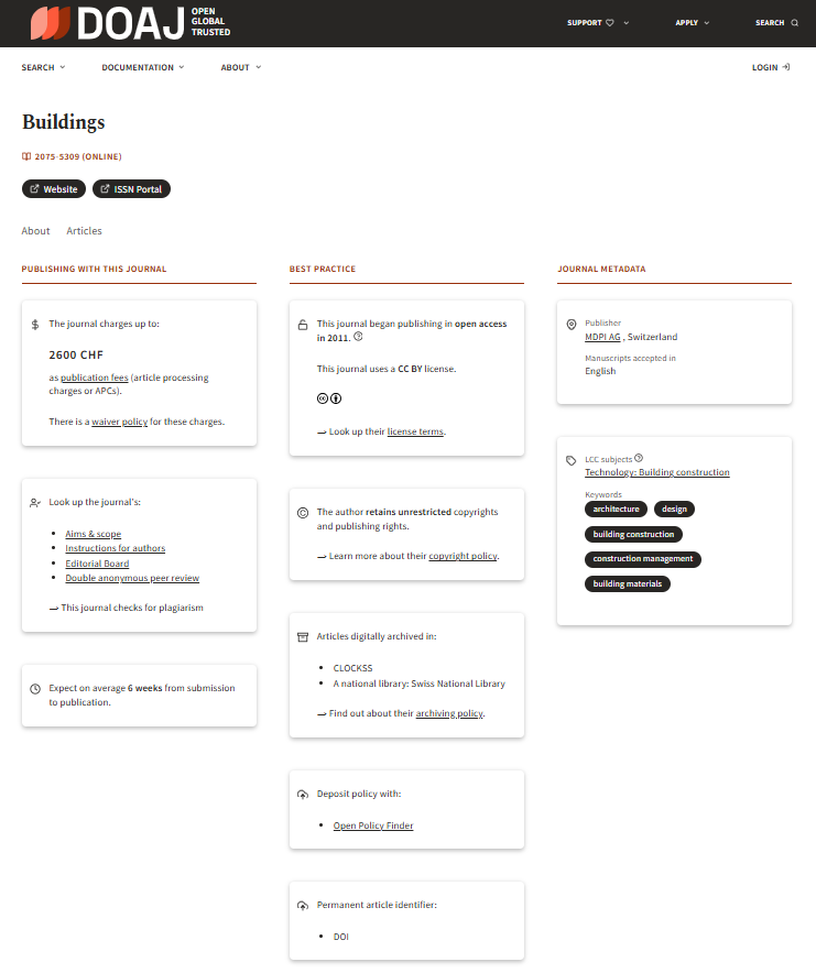 Tạp chí Buildings là một ấn phẩm khoa học được bình duyệt nghiêm ngặt và xuất bản dưới hình thức truy cập mở bởi nhà xuất bản MDPI (Thụy Sĩ). Tạp chí tập trung vào các lĩnh vực kiến trúc, thiết kế công trình, xây dựng dân dụng, vật liệu và quản lý xây dựng hiện đại. Đây là diễn đàn học thuật dành cho giới nghiên cứu, kỹ sư xây dựng, kiến trúc sư cũng như các nhà hoạch định chính sách có quan tâm đến phát triển đô thị và bền vững trong xây dựng.