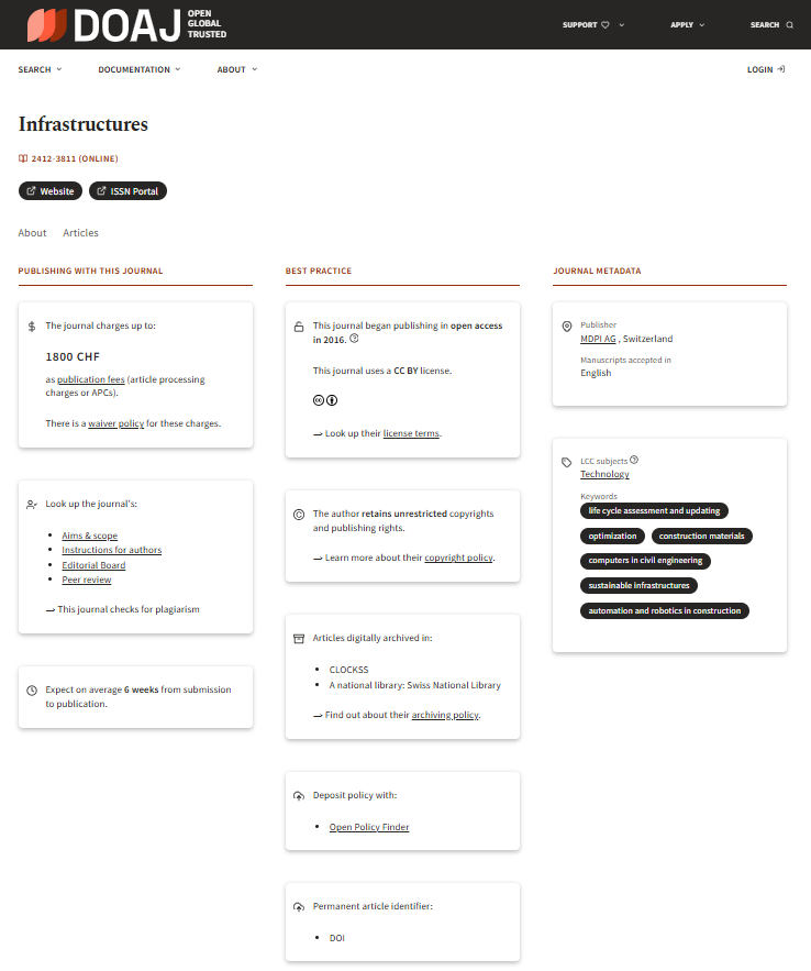 Infrastructures là tạp chí khoa học quốc tế do MDPI phát hành, tập trung vào nghiên cứu, đánh giá và phát triển hệ thống hạ tầng hiện đại. Phạm vi chủ đề rất đa dạng, từ giao thông, năng lượng, đô thị thông minh, kết cấu công trình, vật liệu xây dựng cho đến các mô hình đánh giá hiệu quả và độ bền của hạ tầng trong điều kiện thực tiễn và môi trường khắc nghiệt.